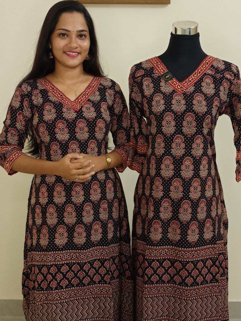 Another exclusive launch of Pure Ajrakh Cotton Aline Kurtis with patchwork on neckline and sleeve ends and hem area with border design.